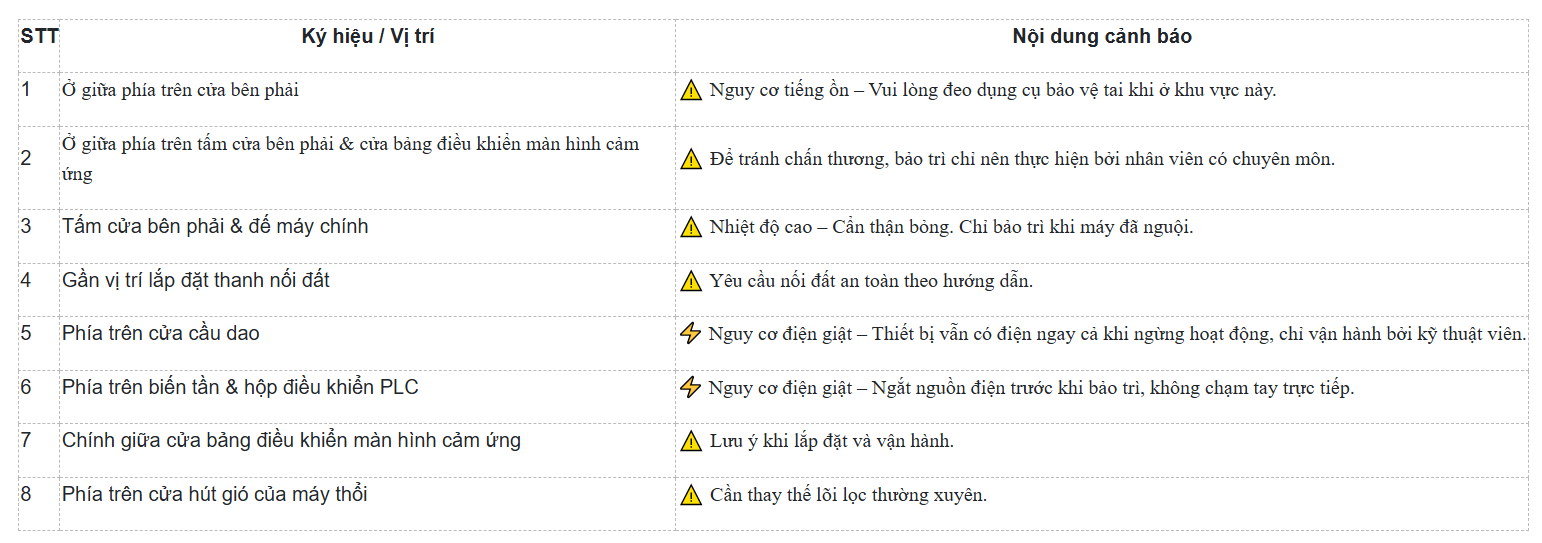 Dưới đây là các ký hiệu và vị trí cảnh báo quan trọng trên máy: