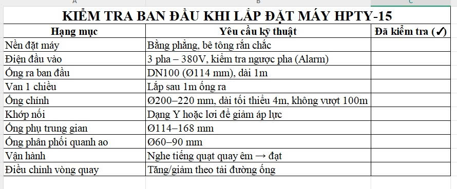 Bảng kiểm tra này giúp bạn đảm bảo mọi thông số kỹ thuật – từ nền đặt máy, điện đầu vào, đường ống, khớp nối đến vận hành – đều được thực hiện chính xác, giúp thiết bị hoạt động ổn định, bền bỉ và đạt hiệu suất tối ưu.