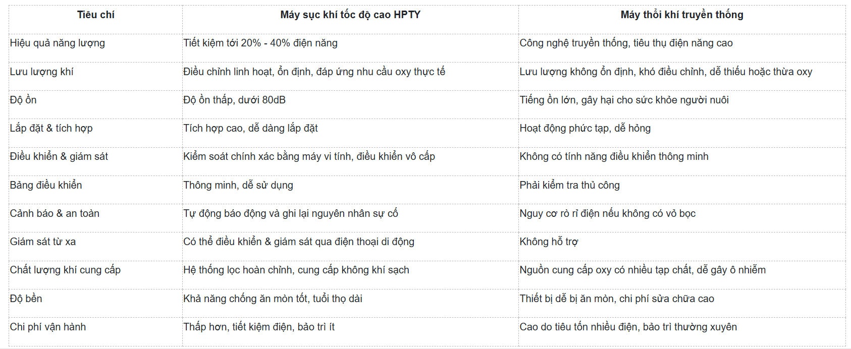 - Máy sục khí tốc độ cao HPTY vượt trội hơn hẳn so với máy thổi khí truyền thống ở hầu hết các tiêu chí: tiết kiệm điện, độ bền, chất lượng khí sạch, vận hành thông minh, và chi phí bảo trì thấp. Đây là lựa chọn tối ưu cho các hệ thống xử lý nước thải và nuôi trồng thủy sản hiện đại.