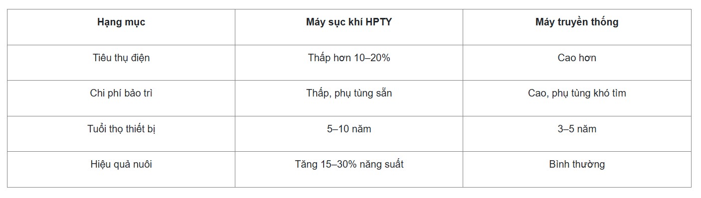 Nhìn bảng này là thấy ngay: Máy sục khí HPTY vừa tiết kiệm, vừa bền, vừa hiệu quả – chính là yếu tố giúp người nuôi “an tâm” đầu tư.