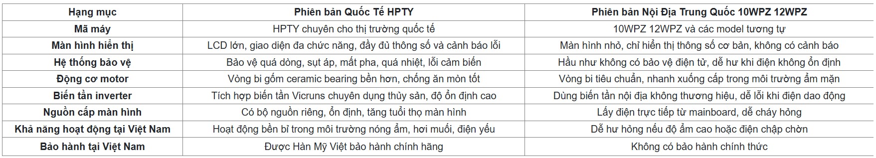 - Phiên bản quốc tế HPTY là lựa chọn tối ưu cho môi trường nuôi tôm Việt Nam nhờ vận hành ổn định, bền bỉ và có đầy đủ chính sách bảo hành.